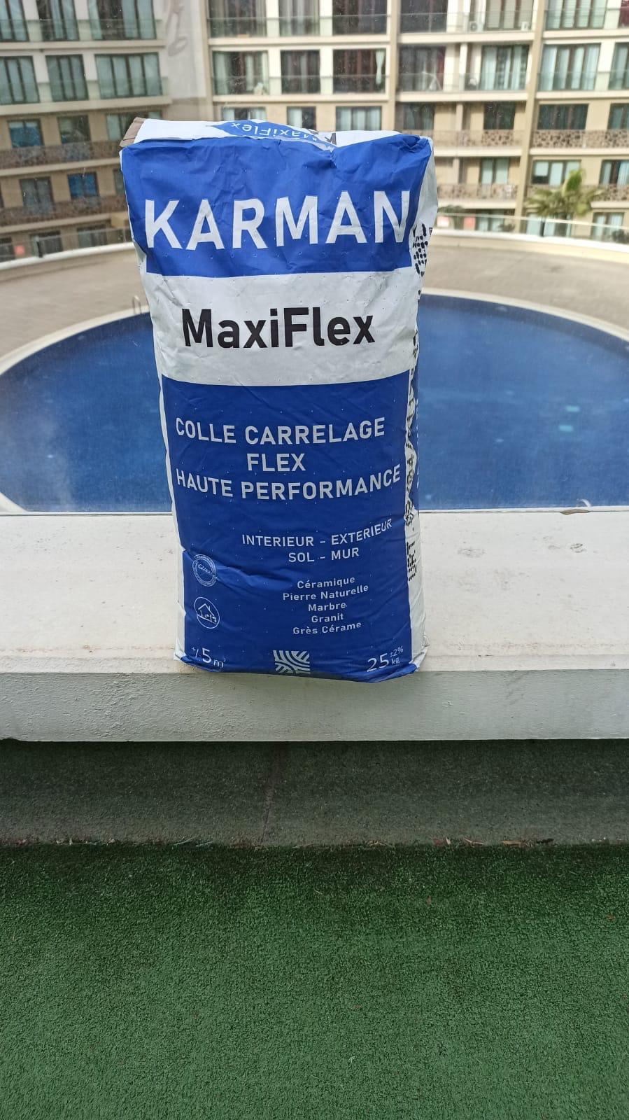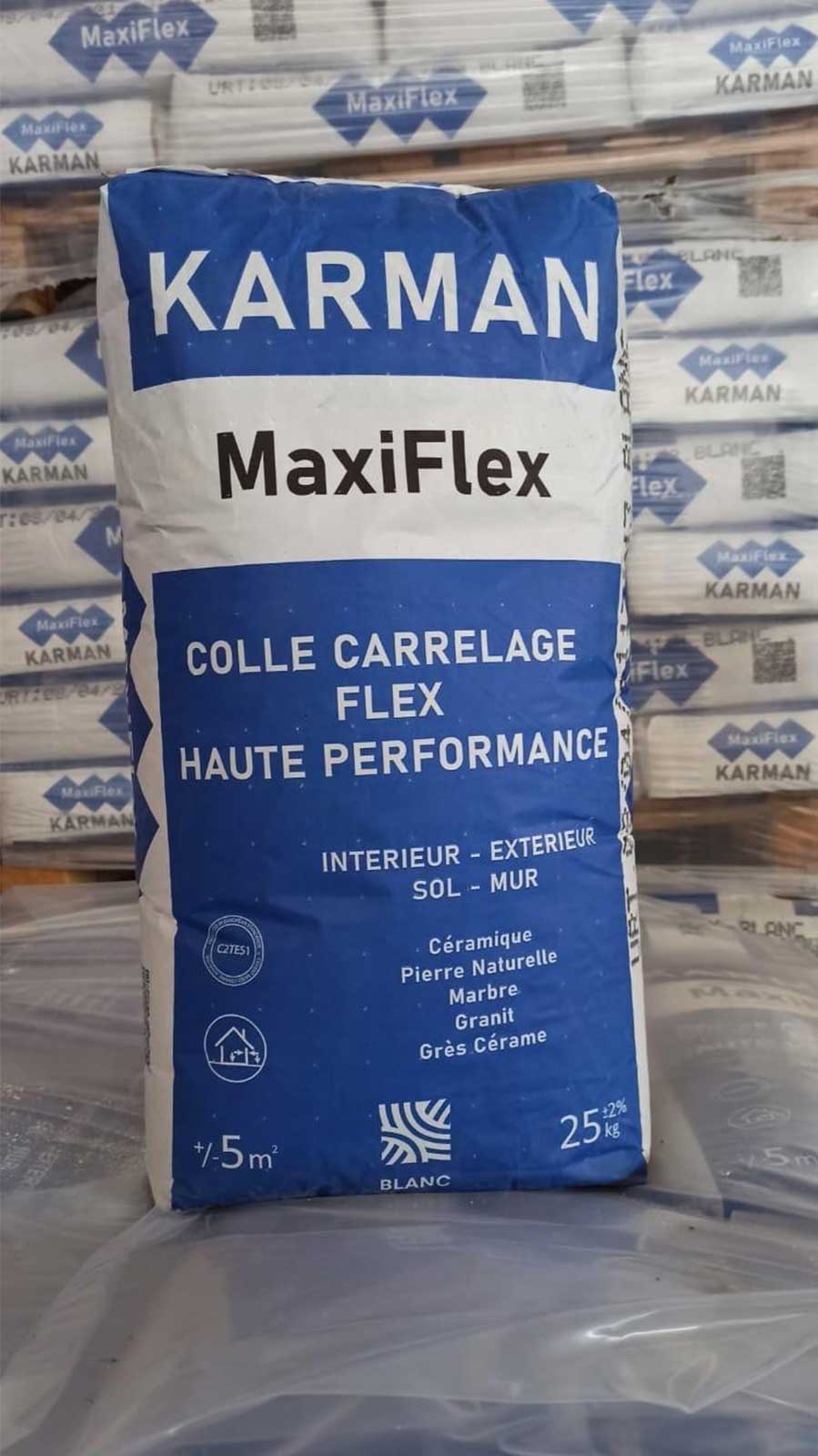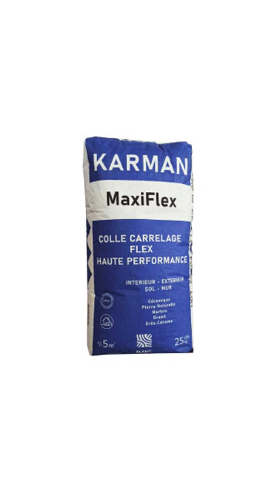 Notre colle pour carrelage professionnelle Karman MaxiFlex est un mortier-colle haute performance C2TE S1, déformable et résistant au glissement. Spécialement formulée pour garantir une adhérence forte et durable, elle est idéale pour une grande variété de matériaux, tels que la pierre naturelle, le marbre, le granit, la pierre artificielle, la céramique et le grès cérame. En plus de sa polyvalence, Karman MaxiFlex est particulièrement adaptée pour les environnements exigeants comme les piscines et les sols chauffants. Facile à appliquer, elle est disponible en deux couleurs (gris et blanc) et se présente en sacs de 25 kg.