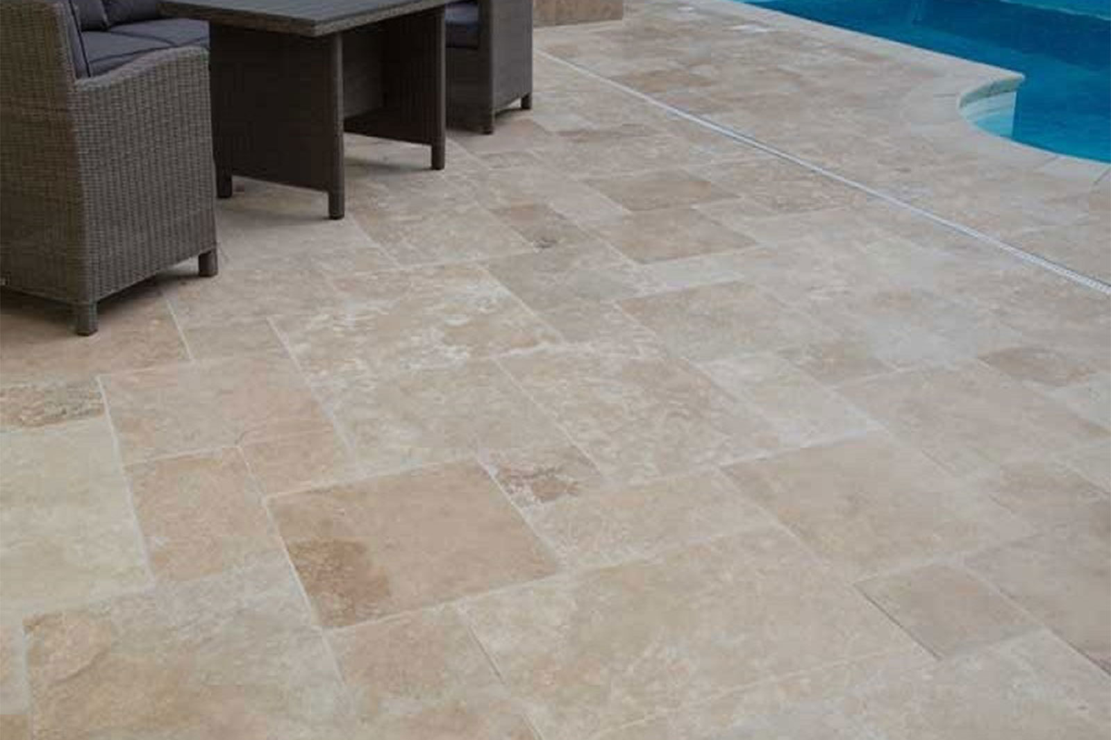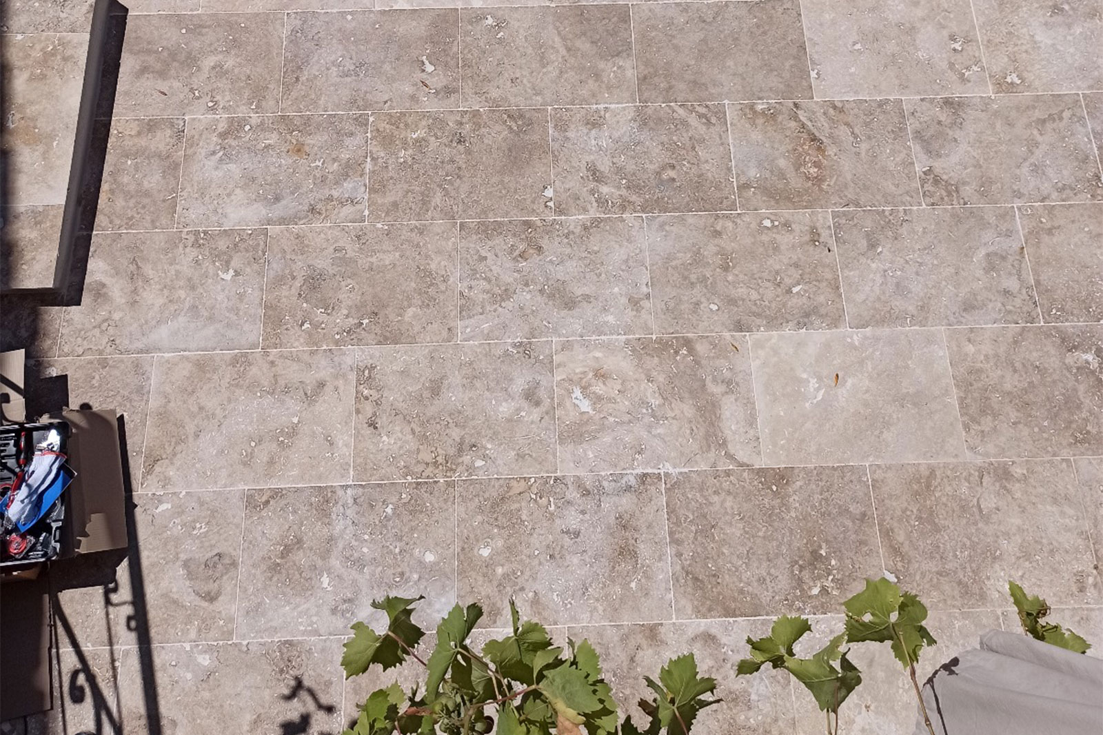 - Disposez les dalles de travertin pour visualiser le motif avant de commencer l’installation.